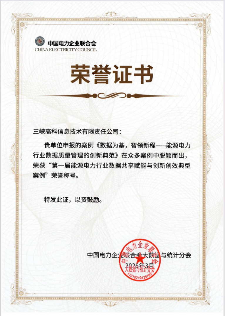 近日,從中國電力企業聯合會大數據與統計分會主辦的“第一屆能源電力行業數據要素發展生態大會”傳來喜訊,三峽高科申報的案例《數據為基,智領新程——能源電力行業數據質量管理的創新典范》在眾多案例中脫穎而出,榮獲“第一屆能源電力行業數據共享賦能與創新創效典型案例”榮譽稱號。